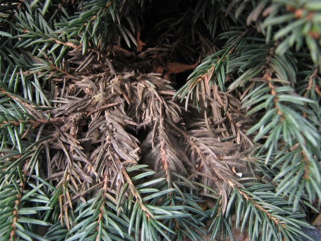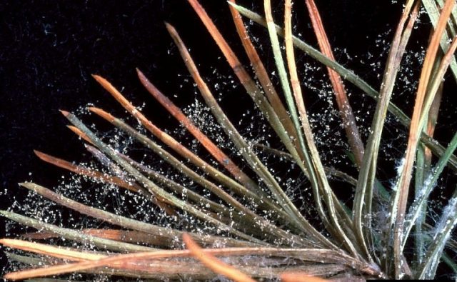La araña roja es otra plaga peligrosa que puede destruir completamente el pino. El insecto no solo se alimenta de los jugos vitales de las agujas de las coníferas, sino que también enreda los brotes de pino con una tela delgada y densa, que impide el acceso de la luz solar e interfiere con el proceso de fotosíntesis. Bajo la influencia de un ácaro, las agujas de pino se secan rápidamente, cambian de color primero a rojo y luego a marrón, y finalmente se desmorona.