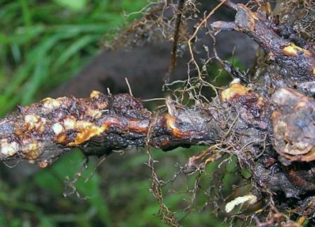 Una enfermedad peligrosa e insidiosa son las numerosas pudriciones: enfermedades del pino en el tronco, que también afectan las raíces. Su efecto se manifiesta en el hecho de que con el tiempo, las agujas comienzan a amarillear y a desmoronarse, y la madera del tronco pierde su densidad y adquiere muchos vacíos. Las raíces de la planta también pierden su vitalidad, el pino se vuelve frágil y puede caer incluso con un viento moderadamente fuerte.