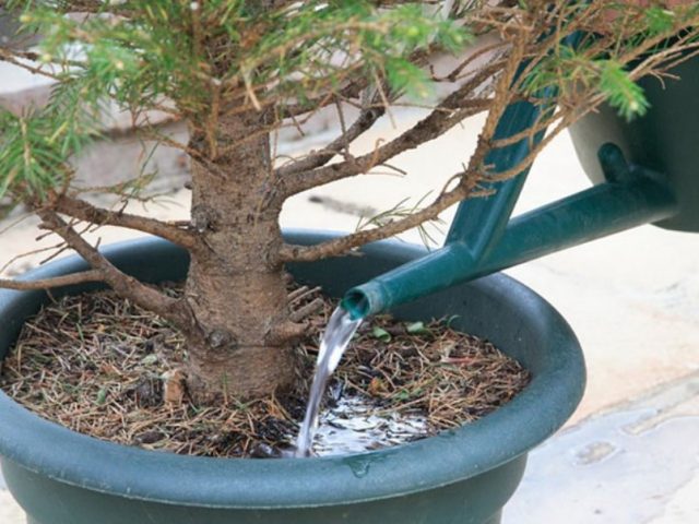 El riego de las plantas se realiza de acuerdo con el esquema habitual para plantas ornamentales. El suelo se riega con agua tibia (2-3 ° C por encima de la temperatura ambiente) hasta un estado de humedad media. El riego se suele realizar una vez a la semana. Una maceta de 5-10 litros no requerirá más de 0.5-1 litros de agua para un riego.