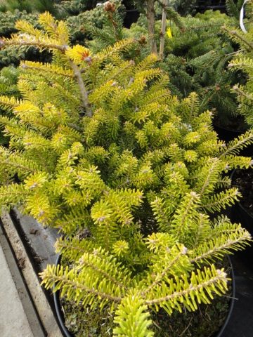 El abeto dorado original tiene un color permanente verde-amarillo o dorado. Pertenece a las razas enanas, cuyo crecimiento rara vez supera 1 m.