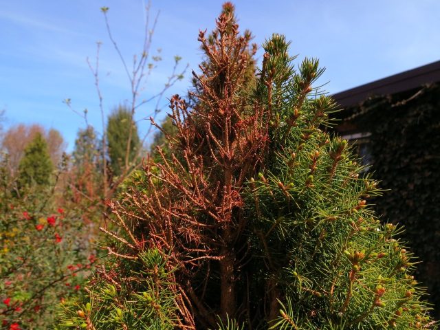 Debe cubrir la planta con arpillera, cartón o material blanco no tejido, de lo contrario, las agujas se quemarán y las agujas del abeto de Konik se caerán. Si la aspersión se realiza en primavera y verano y la corona se rocía con epin, volverán a crecer, pero la decoración se perderá durante una temporada o más. En el peor de los casos, la planta puede morir.
