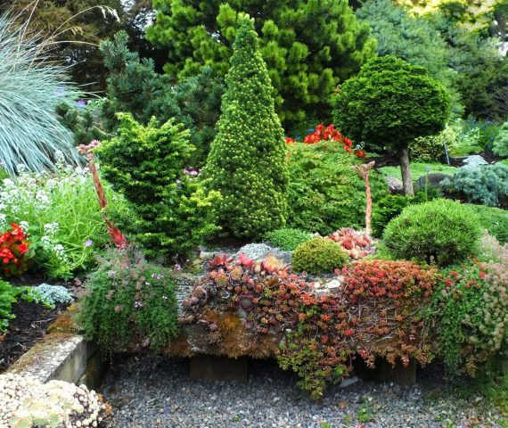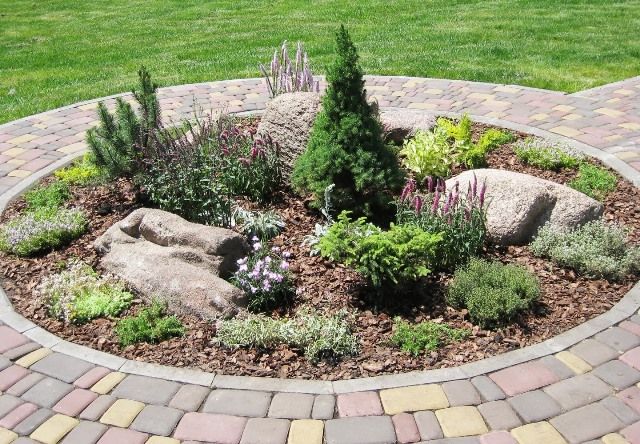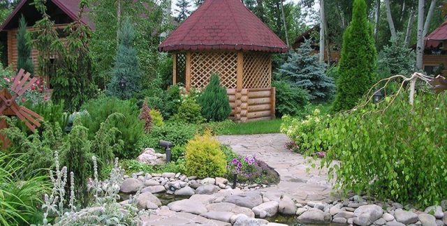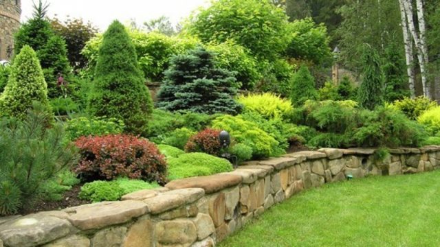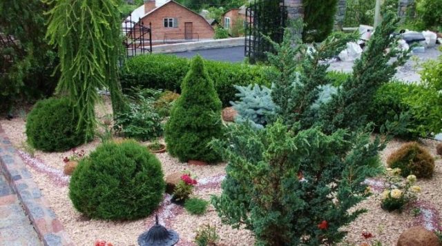 El color de las agujas y la forma de la corona de Konica te permite combinarlo con flores de cualquier forma y color. Es importante colocarlos de manera que las culturas no compitan entre sí por la atención de los propietarios o visitantes del sitio.Para hacer esto, primero debe determinar si Konica será una planta focal o simplemente un fondo para flores y arbustos ornamentales. Y ya en base a esto, construye una composición de paisaje.