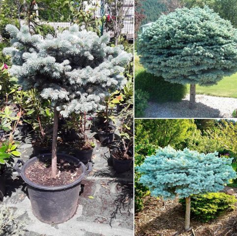 El abeto Glauka Globoza injertado en un tallo es caro, pero se ve impresionante. Tolera bien la poda y puede tener forma de bola, paraguas o cono. Tal árbol a menudo se cultiva en un macizo de flores o en un recipiente.