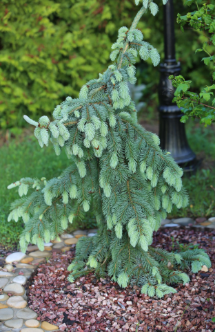 Si el abeto Omorica Pendula Bruns no está atado, al principio se estira y luego el conductor comienza a doblarse. De modo que no hay dos ejemplares idénticos cultivados sin soporte. Las ramas inferiores, sin podar, se apoyan en el suelo y forman una especie de falda.