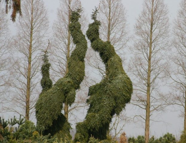 Al manipular la liga y los soportes, puede crear una planta fantástica de abeto Pendula. Crecerá alto y delgado, inclinado hacia un lado o curvándose en diferentes direcciones. Además, nadie lo obliga a atar el soporte estrictamente verticalmente: puede usar varios a la vez y guiar no solo al líder, sino también a las ramas laterales.