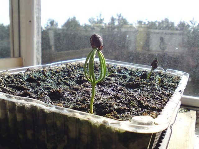 Después de que aparecen los brotes, se retira la película. Para proteger los brotes emergentes de enfermedades, se recomienda regar el suelo con una solución de manganeso rosa pálido. Esta medida evitará el desarrollo de enfermedades fúngicas, pero al mismo tiempo ralentizará el crecimiento del pino.
