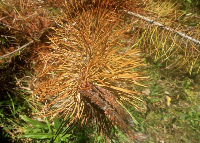 La caída de agujas en el pino de Pitsunda puede ser provocada por la aparición de escamas. Para el tratamiento, use Akarin (30 g), diluido en 10 litros de agua. La pulverización de la corona se realiza en mayo-junio.