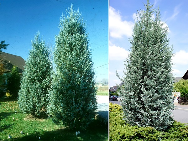 Forma una corona en forma de cono estrecho, con una punta afilada y ramas apretadas. Esto hace que el árbol parezca estar dirigido hacia el cielo. Además de la corona excepcionalmente hermosa, este enebro rocoso con agujas azules llama la atención. Las agujas son afiladas a una edad temprana, con el tiempo se vuelven escamosas. Pero en la parte superior del árbol y en los extremos de las ramas adultas, las agujas pueden permanecer espinosas.