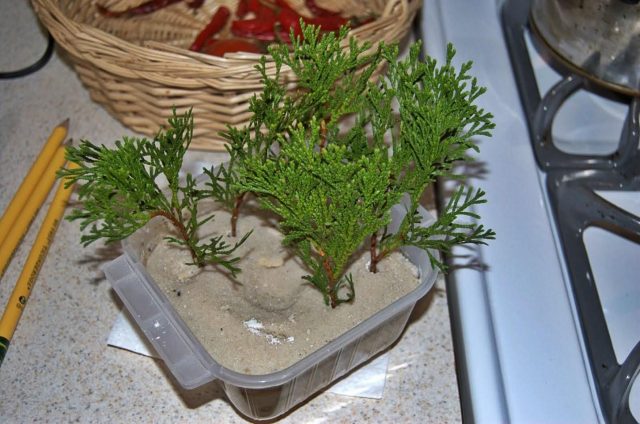 Los esquejes de primavera de coníferas son muy raros. Los expertos creen que este período no es adecuado para el enraizamiento. Los brotes pasan el verano al aire libre, en invierno necesitan calor ambiental.
