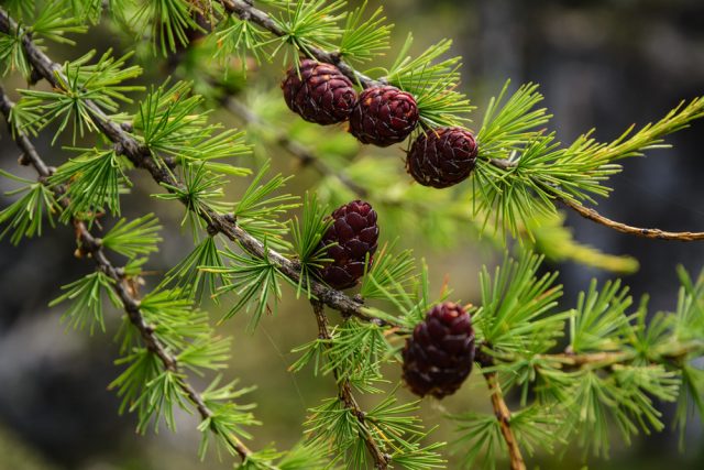 También puede distinguir los árboles entre sí por la forma de los conos. En pino, son cónicos, como en la mayoría de las coníferas, y en alerce, son redondos.