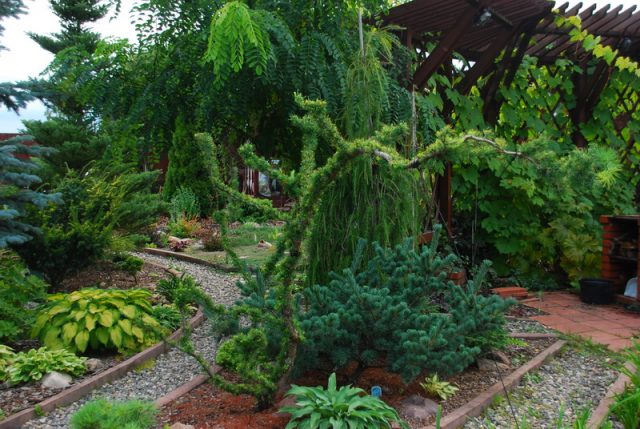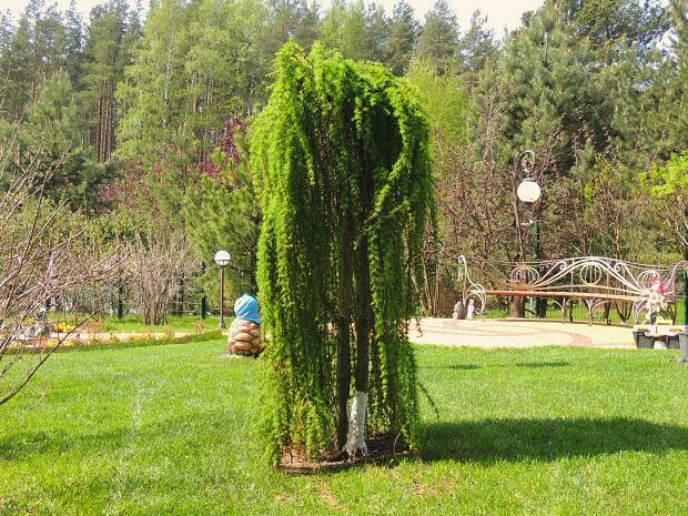 - En la composición de las composiciones vegetales, el árbol suele desempeñar el papel del acento principal. Se puede combinar tanto con coníferas de bajo crecimiento como con flores perennes.