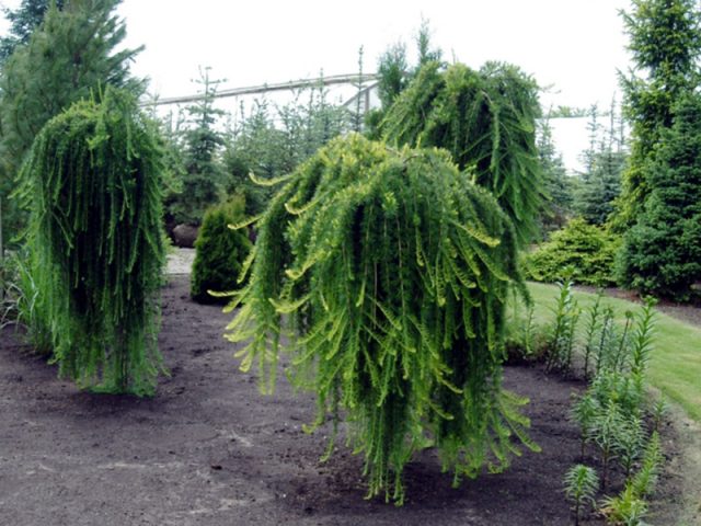 Pendula se ve bien en las orillas de los reservorios artificiales y como parte de las composiciones vegetales. Los brotes de la variedad no solo pueden hundirse en el suelo, sino que también pueden tumbarse en el suelo con una alfombra verde. El tono de las agujas de esta variedad en el verano es de color verde azulado.