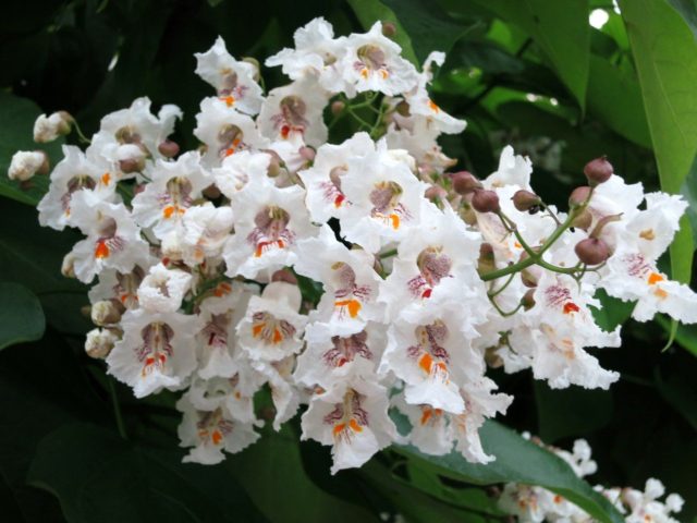 Las flores tubulares cremosas alcanzan 6-8 cm de longitud, formando inflorescencias sueltas. Los pétalos de las flores de la hermosa catalpa se ondulan a lo largo del borde. En el interior, puedes ver rayas amarillas y puntos marrones. El fruto de esta especie está representado por una cápsula estrecha.