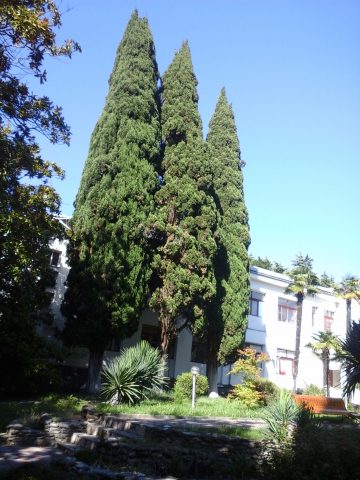 El ciprés piramidal es un árbol conífero alto de hoja perenne común en la costa de Crimea. Pertenece a la familia de los cipreses. La corona en forma de flecha, inherente al ciprés piramidal de hoja perenne, fue creada por los griegos de la antigua Grecia. No se encuentra en la naturaleza salvaje; el ciprés piramidal fue criado por criadores del Jardín Botánico Nikitsky. El árbol padre es un ciprés de hoja perenne, que se diferencia de la disposición piramidal de las ramas, que se encuentra en el norte de Irán, Asia en la costa mediterránea.
