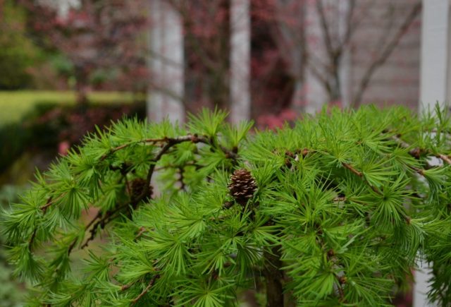 Las agujas de alerce se desmoronan con el clima frío. Conos en forma de huevo de hasta 2-3 cm de tamaño, de color verde amarillento y marrón rojizo. Aparecen en árboles maduros después de 8-10 años de desarrollo.