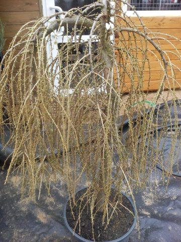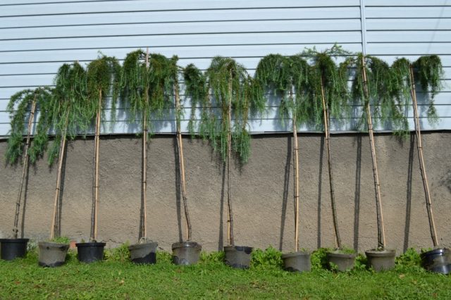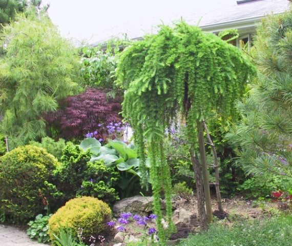 Para pequeñas parcelas de jardín, es mejor comprar solo una forma de Pendula injertada en un tronco, un árbol de crecimiento bajo de hasta 1,5-3 m de altura. Los alerces naturales altos se elevan entre los 15 y los 8-10 m. Los árboles estándar son universales para el diseño, combinados con muchas otras plantas.