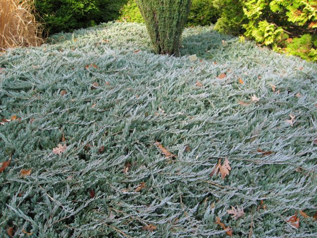 Para crear una alfombra densa con una estructura clara, se plantan variedades rastreras de enebros azules en las áreas. Esta es una especie de alternativa a un césped verde, pero requiere más cuidado. Ventajosamente se combinan plantas horizontales con flox, claveles, hortensias, lilas y cinquefoil. En general, los enebros azules se ven impresionantes en fotos de paisajes, en parcelas. Pueden agregar color al jardín de invierno.