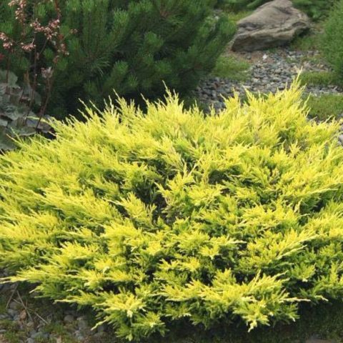 Para la siembra conjunta en un macizo de flores, el tono limón del enebro se combina con flores púrpuras, lilas o amarillas. El arbusto de hoja perenne se combina en una composición con agracejo, hortensia de panícula, brezo.Las hostas se plantan a partir de cultivos de bajo crecimiento junto a enebros horizontales.