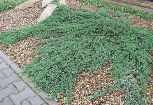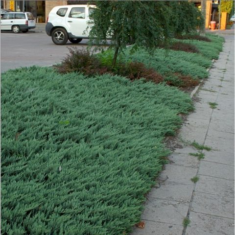 Una especie de enebro de bajo crecimiento, sin pretensiones en el cuidado, crece en casi todos los suelos. Con el tiempo, expandiéndose, forma una densa alfombra de ramas, que no son fáciles de desmontar.Esta característica del arbusto de coníferas se usa ampliamente en el diseño de jardines domésticos, áreas de parques, macizos de flores cerca de edificios de oficinas. Juniper Prince of Wales en la foto de abajo se presenta como una opción para una solución de diseño en el diseño del sitio. La masa verde sólida se percibe visualmente como un elemento del césped. El enebro da un crecimiento insignificante, no cambia durante el año y no requiere una poda constante.