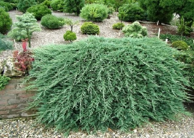 La planta es muy original. Su altura, como en las principales variedades horizontales, no supera los 20 cm, pero la longitud de las ramas alcanza los 2 m, lo que es una característica inusual para los enebros enanos.