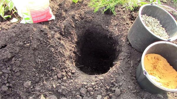 Los hoyos de siembra se preparan a fines de abril, principios de mayo o en la primera mitad del otoño. El ancho y la profundidad del pozo deben ser 3 veces la coma de tierra.En la parte inferior se coloca una capa de drenaje de 20 cm de arena o piedra triturada.