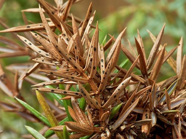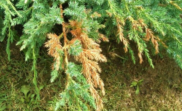 - Traqueomicosis. También es una infección por hongos causada por el hongo Fusarium oxysporum. En este caso, las agujas del enebro se vuelven amarillas y se desmoronan, y la corteza y las ramas se secan. Primero, las copas de los brotes mueren y, a medida que el micelio se extiende, todo el árbol muere.