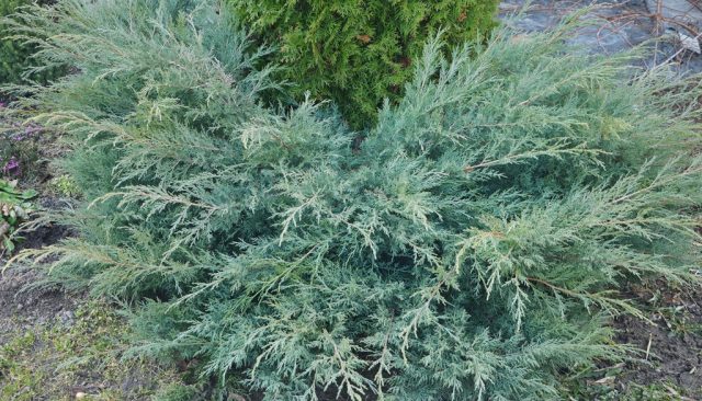 El enebro de hoja perenne Virginia Grey Oul decorará el jardín en verano con agujas de color azul claro, en otoño, con bayas grises, en invierno, con brotes de color lila.