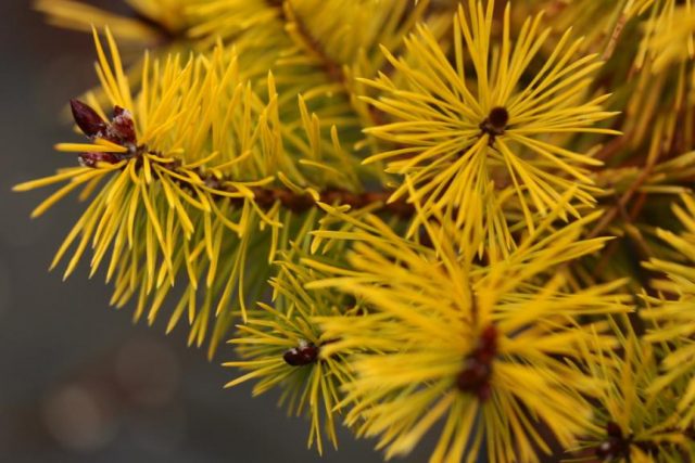 El crecimiento joven es cremoso, en verano se vuelve amarillo dorado. Luego, las agujas cambian gradualmente de color a verde. En sombra parcial, el color de las agujas del abeto canadiense Rainbow End no es demasiado brillante. Si los rayos del sol son muy escasos, el color amarillo aparece débilmente.