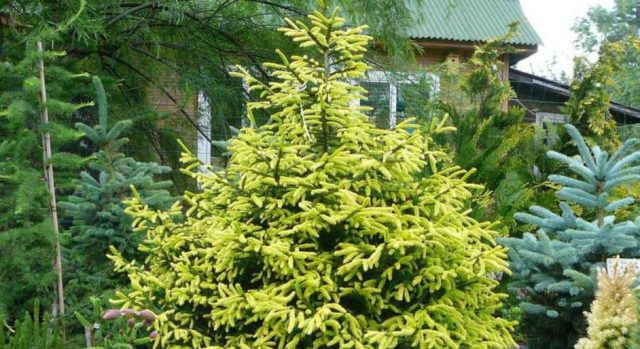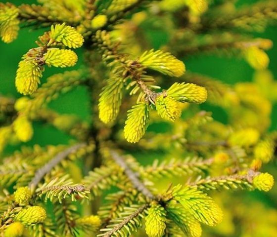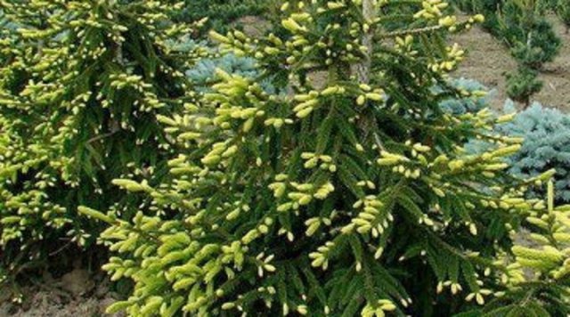 Variedad de selección alemana. El tamaño máximo de la picea es de 12 m de altura y 5 m de ancho, a los 10 años alcanza los 2,5 y 1,5 m, respectivamente, a los 30 años crece hasta los 6-8 m. el abeto difiere en la apertura tardía de las yemas: los brotes jóvenes dorados aparecen en junio. Con el tiempo, las agujas se vuelven de color verde oscuro.