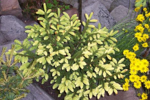 Esta es una de las variedades de abeto oriental más populares en el diseño de paisajes. Fue criado en 1952 en granjas de Nueva Jersey. Abeto con agujas cortas, que al principio es de color amarillo brillante, luego se vuelve dorado y solo al final de la temporada adquiere un color verde oscuro. La copa es piramidal, en una planta adulta se estrecha y se estira.