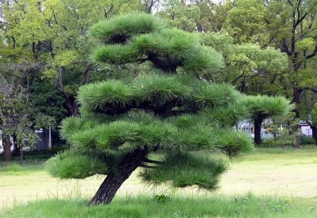 En una parcela grande, las "velas azules" independientes, el pino negro japonés con una extraña forma de corona se ven majestuosas. Los árboles se pueden utilizar para delimitar áreas y sus zonas.