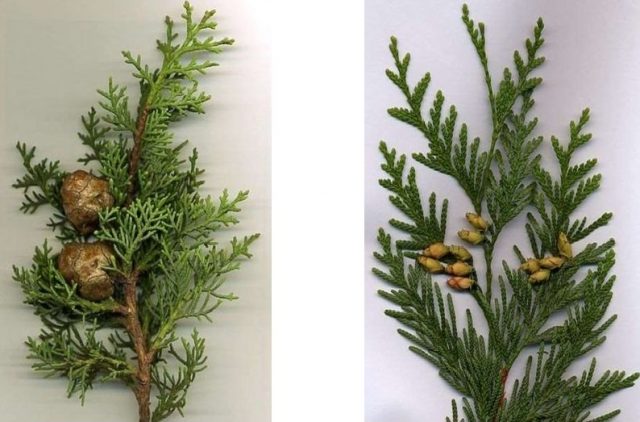 También vale la pena tener en cuenta la ubicación de las agujas, ya que está ubicada en diferentes planos en un ciprés con un olor etéreo pronunciado, y en uno en una tuya, con un olor dulzón bastante brillante.