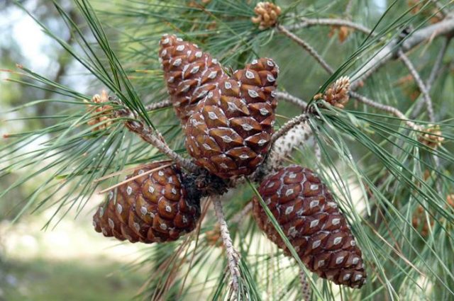 Los conos de pino macho son de tamaño pequeño, comparables al hueso de una cereza, son de color amarillento. Las inflorescencias femeninas pueden ser difíciles de notar, ya que son aún más pequeñas y están ubicadas al final de un verticilo de pino.