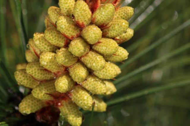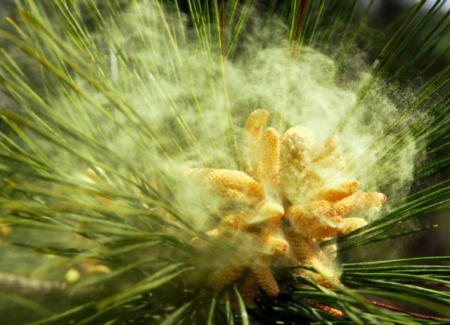La floración del pino es un proceso biológico que permite que la planta se reproduzca. En la primavera, el pino libera brotes jóvenes masculinos y femeninos; solo los brotes masculinos contienen polen. Exteriormente, el polen parece granos redondeados microscópicos en una capa densa. Al final de la floración, las materias primas del pino son transportadas por el viento tanto a distancias cercanas como a muy largas y fertilizan los cogollos femeninos del árbol.