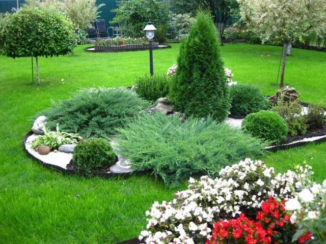 Las composiciones pueden ser diferentes, pero se deben tener en cuenta las necesidades de la calidad del suelo de las coníferas y sus vecinos en flor.