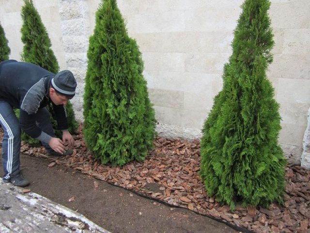 Según los consejos de los especialistas, el aflojamiento excesivo del suelo tiene un efecto perjudicial sobre la fertilidad, ya que durante el procedimiento se mezclan sus capas, en las que viven bacterias de diferentes tipos. Como resultado, se encuentran en un entorno inusual y mueren. La primera vez después de la siembra, el aflojamiento de los círculos cercanos al tallo se realiza con cuidado, a poca profundidad.En el futuro, el cuidado de los círculos cercanos al tallo de las coníferas en el jardín se reduce a mantillo, que retiene la humedad. detiene el crecimiento malas hierbas... El mejor mantillo son las agujas de pino, la corteza fina y la grava. Además de la función decorativa, también lleva otra: deja pasar fácilmente el aire a las raíces. Pero lo más importante es que los hongos viven en agujas en simbiosis con los árboles. No pueden existir por separado el uno del otro. El espesor requerido de la capa de mantillo es de 10 cm.