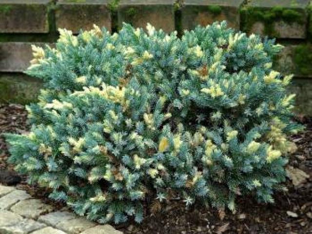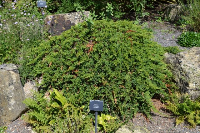 Juniperus squamata Floreant es una mutación de la famosa Estrella Azul y lleva el nombre de un club de fútbol holandés. Francamente, no se parece mucho a una bola, pero es difícil esperar contornos más redondeados de un enebro.