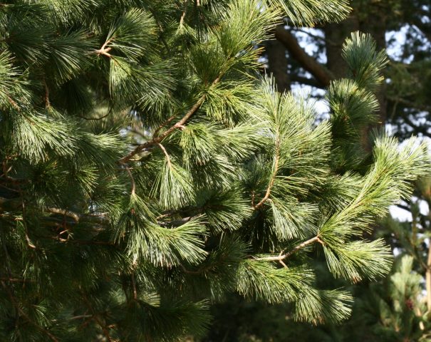 Las agujas de 7-10 cm de largo se recolectan en racimos de 5 piezas, viven de 2 a 5 años. Las agujas son verdes, brillantes, agradables al tacto.