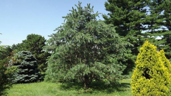 El árbol viejo aumenta significativamente de volumen debido al hecho de que las ramas inferiores pasan al plano horizontal. Esto cambia significativamente la forma de la corona, se vuelve como un cono ancho. Las agujas son azul verdosas, largas, densas.