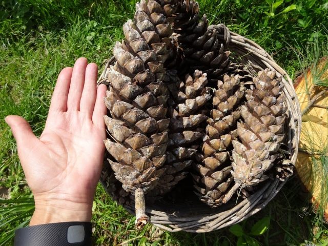 Los conos después de la maduración se vuelven amarillentos, su longitud es de 15 a 32 cm, el ancho no supera los 7 cm. La forma es cilíndrica, ligeramente curvada. Las semillas están provistas de un ala alargada, la longitud total es de unos 30 a 35 mm. El pino florece a finales de abril, el momento es individual y depende de la región de cultivo. Los conos maduran en el segundo año después de la floración, a mediados de octubre.