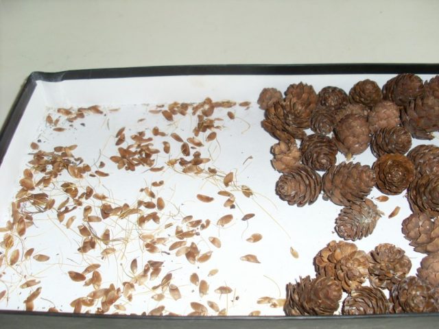 Los conos recolectados se colocan para secar en un lugar cálido y soleado. Es necesario que las escamas se abran completamente y suelten las semillas. Para acelerar el proceso, puede aumentar la temperatura, pero no se recomienda calentar el material a una temperatura alta (más de 45 ° C), porque las semillas pueden perder su capacidad de germinación.