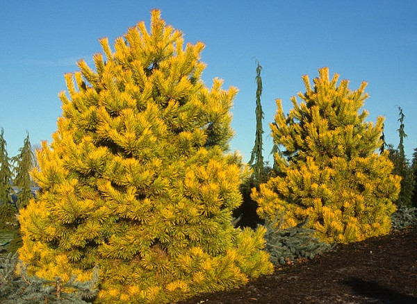 - El pino silvestre ama la luz y crece rápidamente. No hay necesidad de preocuparse por la sombra de las variedades altas. Pero al lado de los enanos, no debes plantar cultivos de crecimiento rápido con una copa ancha que pueda bloquearles el sol.