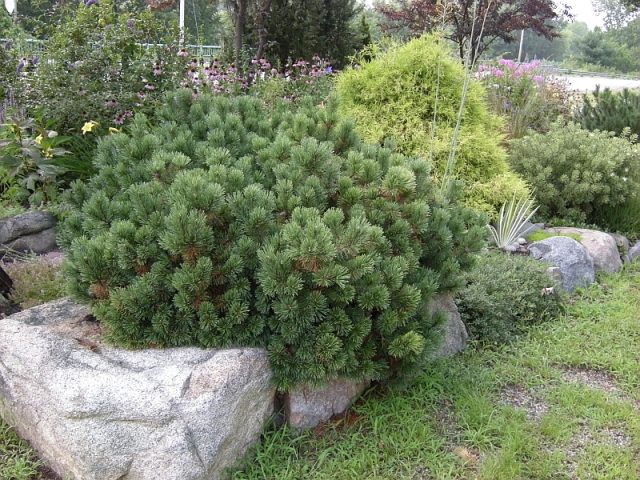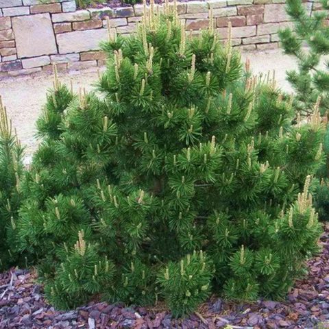 El pino de montaña Mugus se cultiva en macizos de flores con flores poco exigentes a la humedad, entre pequeñas rosas. Iluminará el primer plano de grupos de paisajes grandes y pequeños.