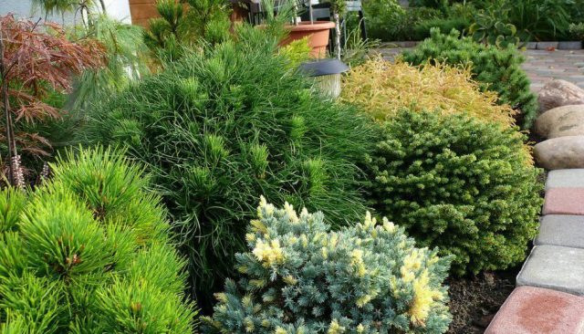 Pero los diseñadores no lo usan como tenia: el pino Mugus es pequeño y gana en plantaciones grupales. Incluso si otras coníferas son sus vecinas.