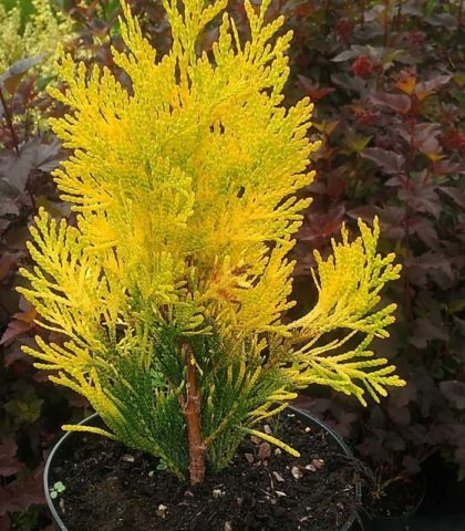 Según la Descripción, Thuja plegada Goldie es una variedad nueva, se considera uno de los representantes más brillantes de esta variedad, con hermosas agujas de color amarillo verdoso, que conservan su riqueza incluso en invierno. La planta prácticamente no necesita ser cortada y conserva la forma cónica correcta de su corona durante toda su vida. En la edad adulta, la altura de la variedad Goldie es de hasta 2,5 m con un diámetro de 1,5 m Los diseñadores de paisajes la utilizan para formar plantaciones individuales en áreas prominentes, para crear contraste en setos de coníferas bajas, así como para composiciones de paisajes individuales. El árbol tiene una tasa de crecimiento promedio, su crecimiento anual es de 10 a 20 cm, a la edad de 10 años alcanza más de 1,5 m de altura. Es una variedad con brotes densos, bastante cortos y densos y agujas engrosadas de color amarillo dorado apuntando hacia arriba. El árbol prácticamente no cambia de color en otoño. Thuja plegada Goldie tiene un sistema de raíces superficial, resistente a las heladas, crece bien en áreas soleadas o ligeramente sombreadas. El crecimiento al sol da más saturación al color de las agujas. Para este tipo de thuja plegada, es preferible un ambiente moderadamente húmedo. La planta es poco exigente para el suelo, pero se desarrolla mucho mejor en un suelo fértil, bien drenado, débilmente ácido y ligeramente alcalino con un contenido de cal. Al plantar un árbol, es importante prestar atención a su cuello de raíz: debe estar estrictamente al nivel del suelo.Los representantes adultos de la variedad Goldie no necesitan refugio para el invierno, sin embargo, las plántulas jóvenes al principio necesitan protección contra los montones de nieve.