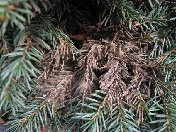 - Shute marrón - a menudo, la enfermedad se manifiesta en la primavera, después de que la nieve se descongela. En las agujas de color verde brillante de la planta, comienzan a aparecer agujas amarillas, marrón rojizo o negras. Las áreas afectadas del árbol comienzan a cubrir los cuerpos fructíferos alargados de los hongos patógenos. Habiendo encontrado los primeros síntomas de la enfermedad, es necesario comenzar un tratamiento inmediato: corte y queme todas las ramas dañadas, y la efedra en sí debe rociarse con una solución al 2% de sulfato de cobre o un medicamento especial: Fundazol.