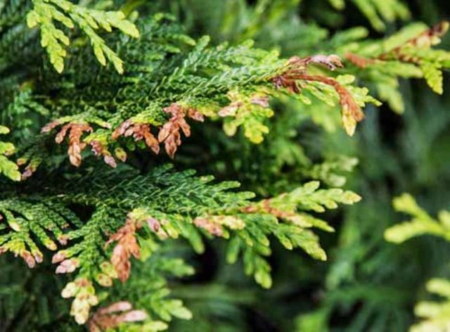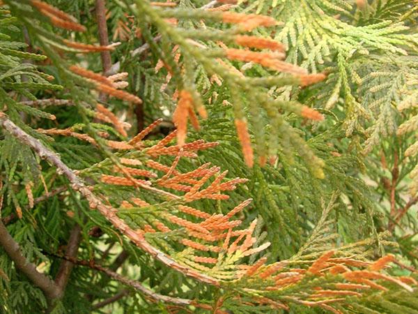 - Podredumbre gris - A menudo afecta a las plántulas jóvenes de efedra. Esta enfermedad se desarrolla debido a una plantación demasiado densa, falta de ventilación y poca luz. Los brotes de Thuja adquieren un tinte marrón parduzco. En la etapa inicial de la enfermedad, rociar thuja plegada con sulfato de cobre ayudará a salvar la planta.