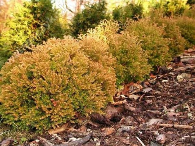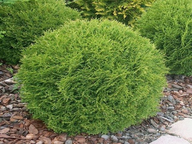 Thuja tiene la forma de un arbusto con una altura de 2 m, un ancho de 1,5 m La forma de la corona es una elipse o cono. Las agujas son delicadas, de color limón o cobre.