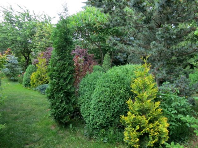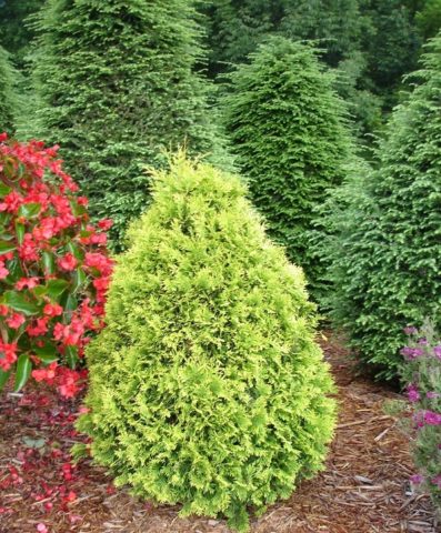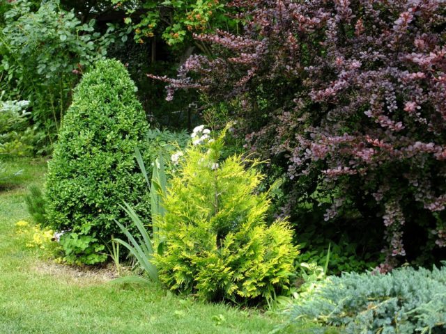 Thuja occidental en primer plano en un grupo que planta con arbustos ornamentales.