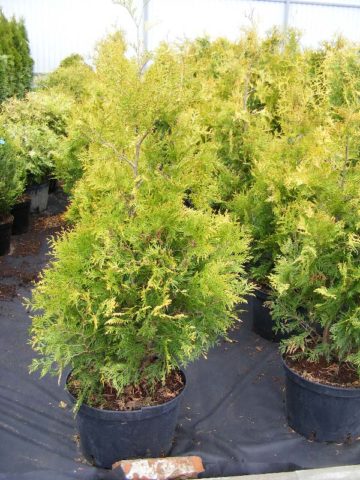 Un árbol piramidal bajo con una copa densa densa, con 2 copas o más blancas. La altura de la cinta Thuja Ellow es de hasta 2,5 m, el volumen es de 0,8 m, lo que es un indicador de una temporada de crecimiento de 15 años. La tuya occidental crece lentamente, agrega 12 cm de altura durante el año, 8 cm de ancho, la planta es perenne, la duración de la vida biológica es de 30-35 años.